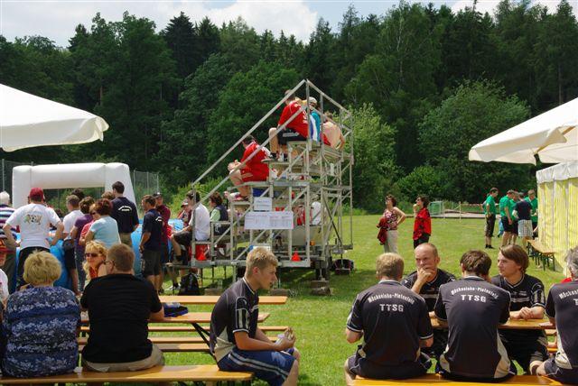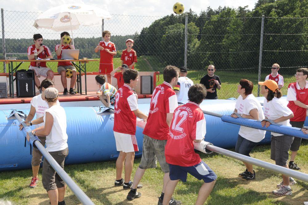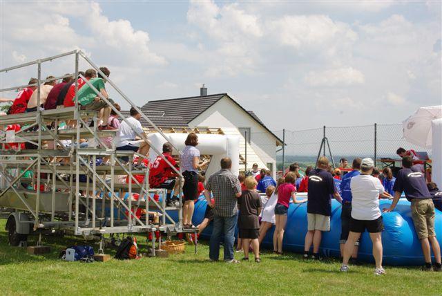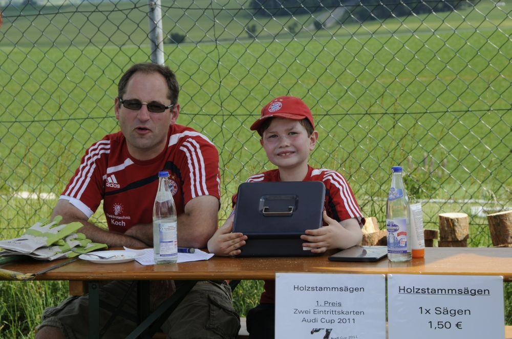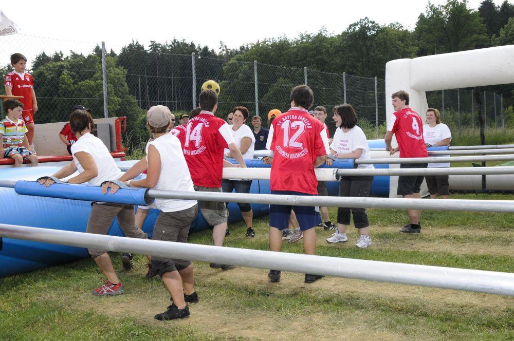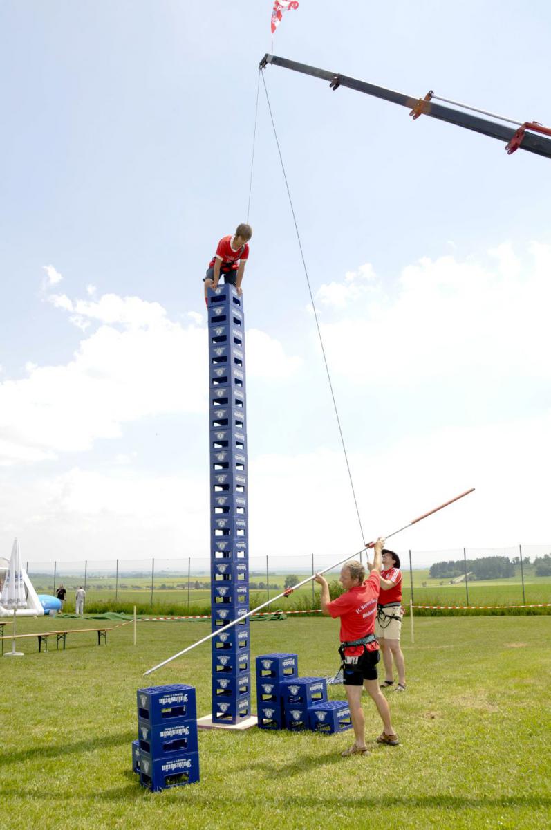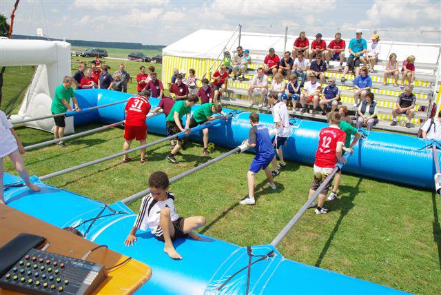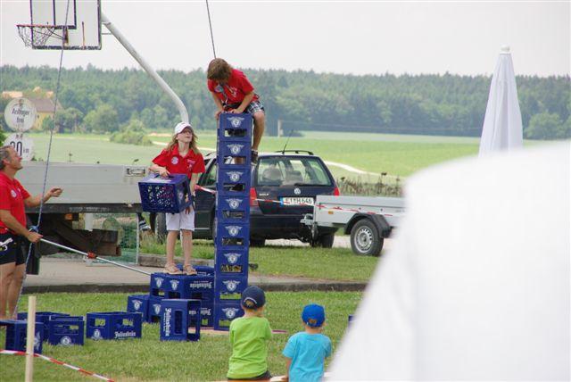 Das Bierkastenstapeln erforderte bei gesichertem Aufstieg viel Übung und Kunstfertigkeit. Antonia Hiermeier siegte hier mit 26 gestapelten Bierkästen knapp vor ihrem Onkel Josef Hiermeier (25 Stück) und ihren Brüdern Kilian (25 Stück) und Valentin (24 Stück). Die Vorstände Frank Schmidt und Christian Meier hatten beim Holzstammsägen als Vorgabe ein Stück mit 949 Gramm vorgelegt. Nun mussten die Teilnehmer möglichst nahe an dieses Gewicht herankommen. Christoph Meyer und Daniel Fuchs gelang dieses Kunststück bis auf 10 Gramm auf 939 Gramm. Es platzierten sich weiter Florian Meier und Maria Geitner mit 925 Gramm und Kevin Schmidt und Roland Schmidt mit 919 Gramm. Das Torwandschießen war ein weiterer Renner. Über 50 Personen versuchten hier ihr Können. Daniel Fuchs gewann mit 2 Treffern nach Losentscheid vor Benjamin Reinl und Tobias Stark (beide ebenfalls 2 Treffer). Hart umkämpft waren beim Menschenkickerturnier die Positionen.