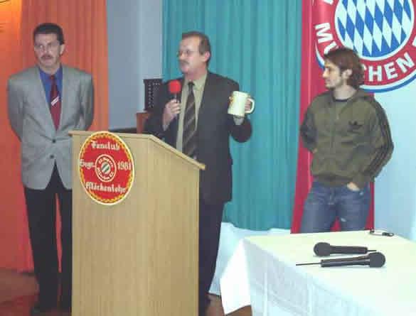 Ünd schon war die Zeit schon wieder um. Im Rahmen der Verabschiedung überreichte Vorsitzender Frank Schmidt dem Gast einen Teller mit dem Wappen des Bayern-Fanclubs aus Möckenlohe. Bixente Lizarazu überreichte im Gegenzug einige Geschenke aus München. Neben diversen Fanartikeln brachte er noch sage und schreibe 100 Freikarten für das Champions-League-Spiel am 10.12.03 gegen den RSC Anderlecht mit.